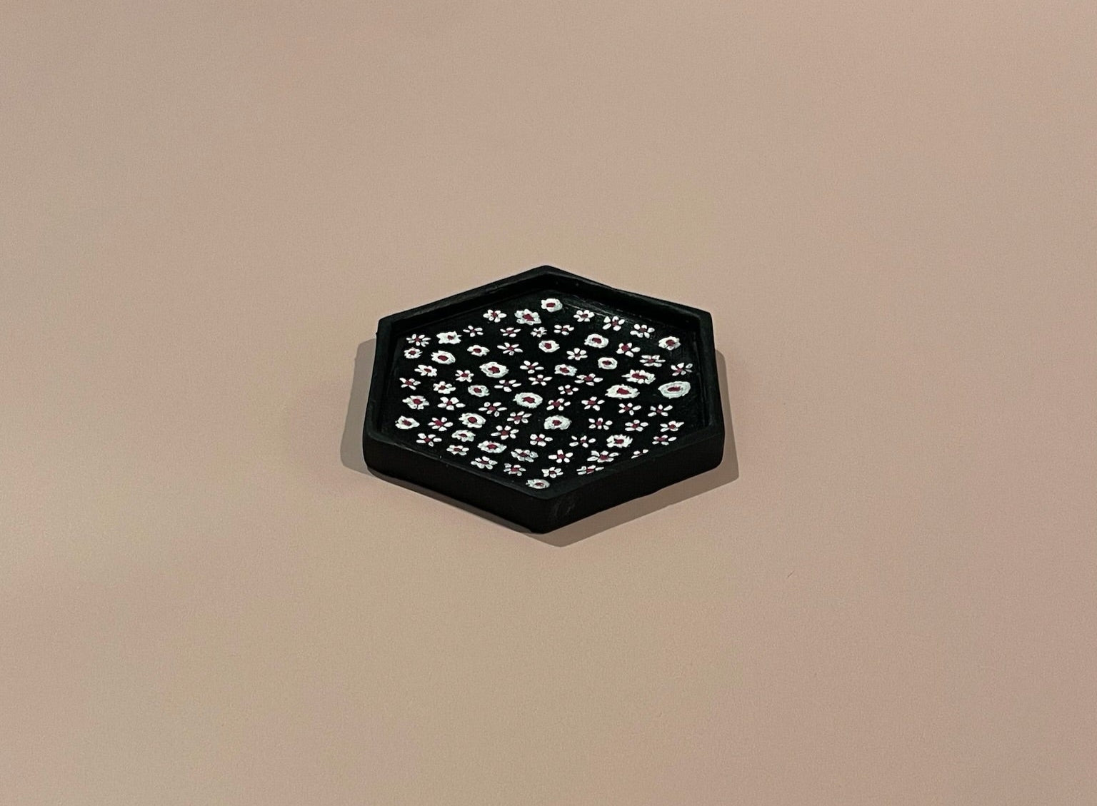 Dark Blue Jesmonite Tray with Hand-Painted White & Pink Flowers