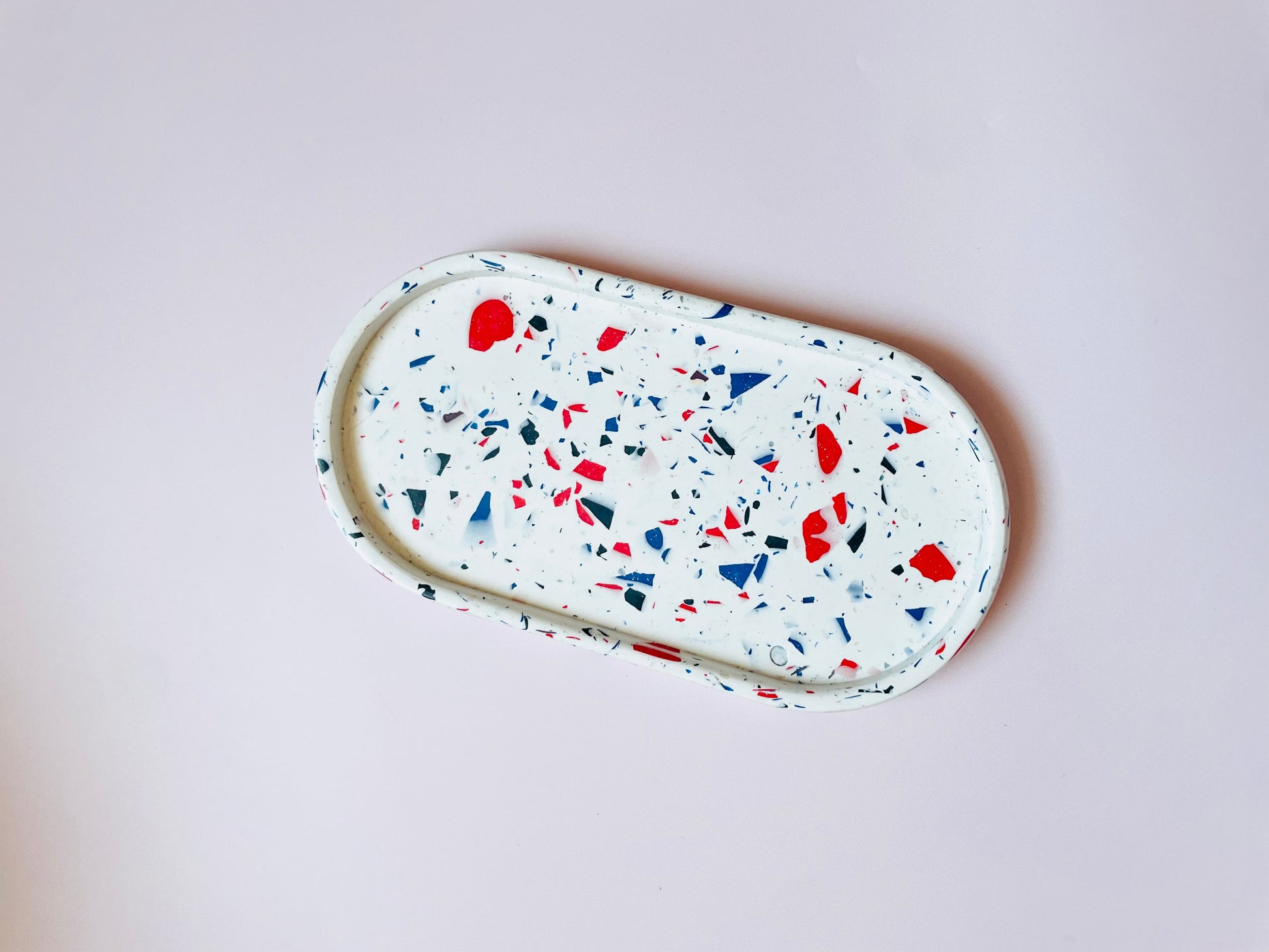It is handcrafted from high-quality Jesmonite, with a terrazzo effect. Among its many uses are candle holder, keys, drink holder, plant tray, jewellery and condiment holder. Modernise your unwanted space or makeup table with it.